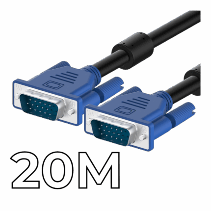 A VGA to VGA cable measuring 20 meters facilitates direct analog video signal transmission between devices equipped with VGA ports.