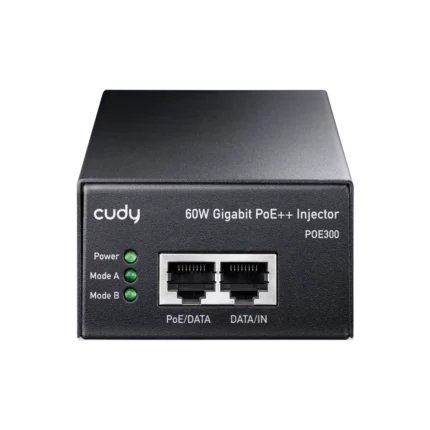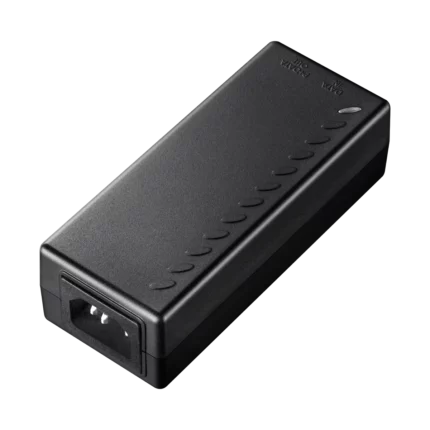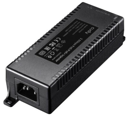 A wall-mounted metal casing PoE adapter injecting up to 90W power to the Ethernet cable to power up the PoE device. Featuring brackets to be firmly attached to the wall.