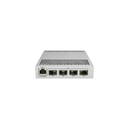 The CRS305 is a compact yet very powerful switch, featuring four SFP ports, for up to 10 Gbit per port. The device has a 1 Gbit copper ethernet port for management access and two DC jacks for power redundancy. The device is a very sleek and compact metallic case without any fans, for silent operation.