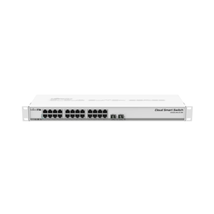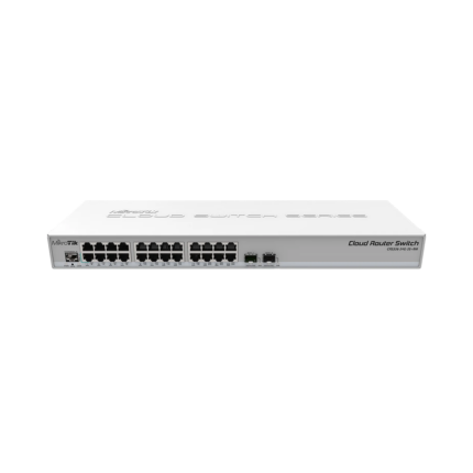 Cloud Router Switch 326-24G-2S RM with 800 MHz CPU, 512MB RAM, 24xGigabit LAN, 2xSFP cages, RouterOS L5 or SwitchOS (dual boot), 1U rackmount case, PSU