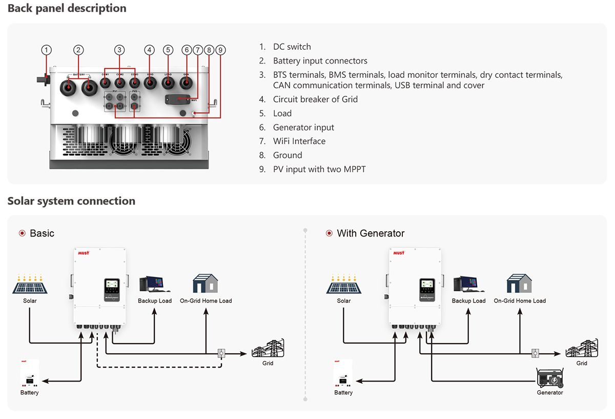 PH1100 EU is brand new three phase hybrid inverter with low battery voltage 48V, ensuring system safe and reliable. With compact design and high-power density, this series supports 1.3 DC/AC ratio, saving device investment. It supports three phase unbalanced output, extending the application scenarios. Equipped with CAN port (x2) BMS and parallel, x1 RS485 port for BMS, x1 RS232 port for remotely control, x1 DRM port, which makes the system smart and flexible.