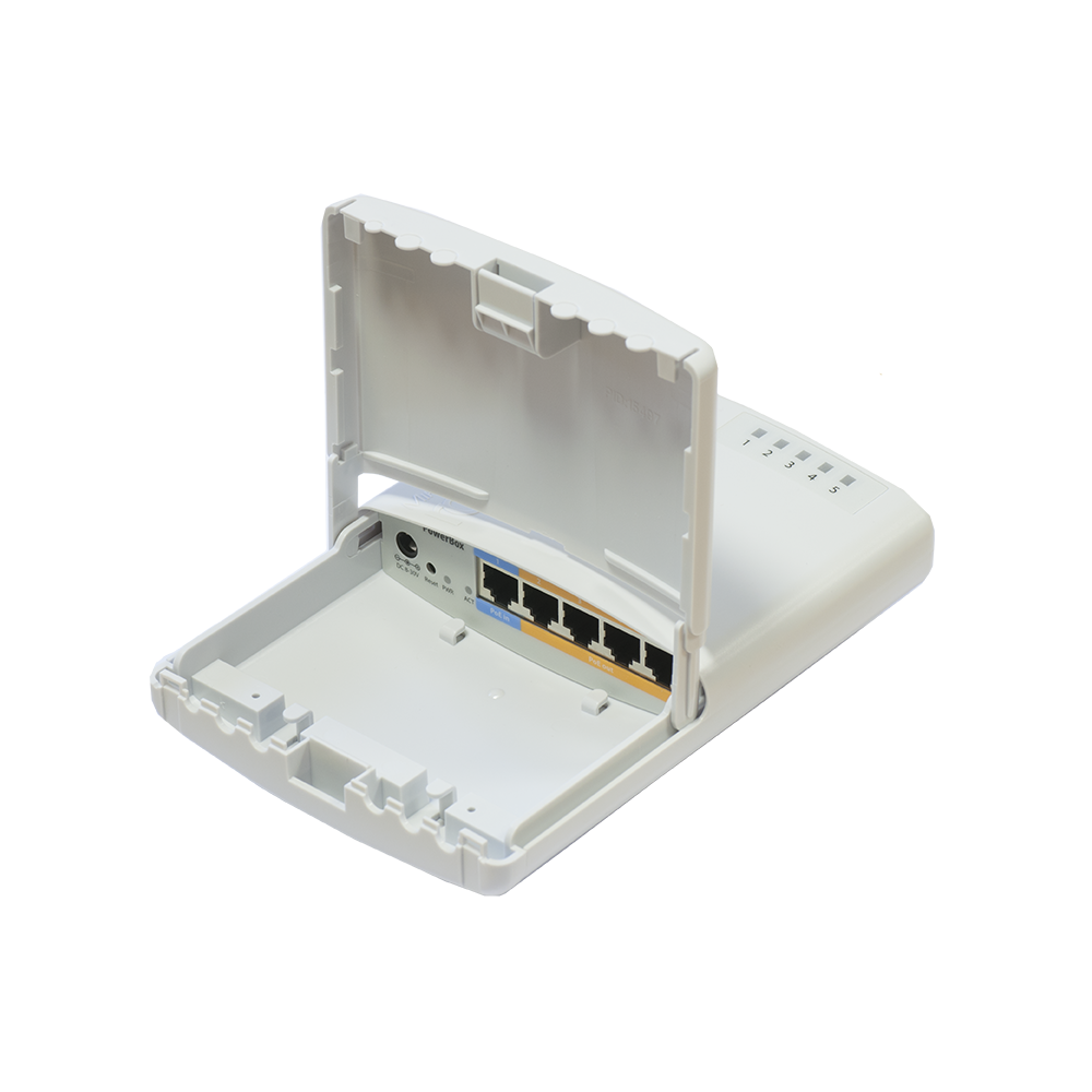 The PowerBox is an outdoor five Ethernet port router with PoE output on four ports. You can use this device to supply power to four PoE capable devices such as our SXT or others.