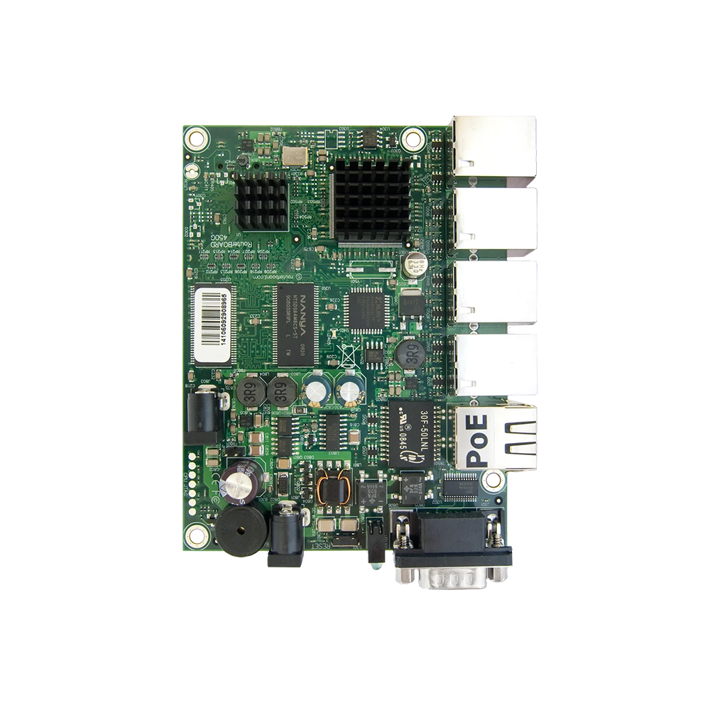 The miniROUTER (RouterBOARD 450G) with 680MHz Atheros CPU, 256MB RAM, 5 Gigabit LAN ports, RouterOS L5